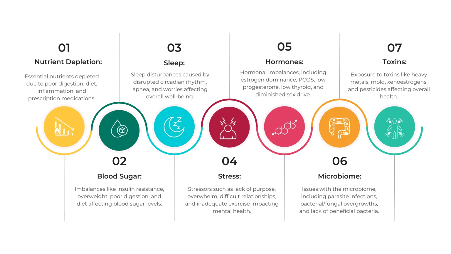Navigating holistic health challenges: Nutrient depletion, blood sugar imbalances, sleep disturbances, stressors, hormonal issues, microbiome imbalances, and toxin exposure.